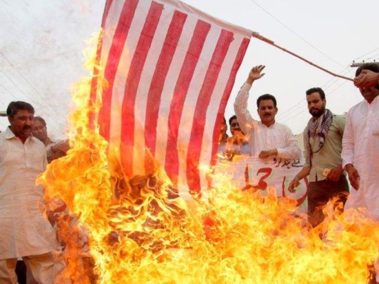 巴基斯坦民众焚烧美国国旗,抗议美军无人机空袭。