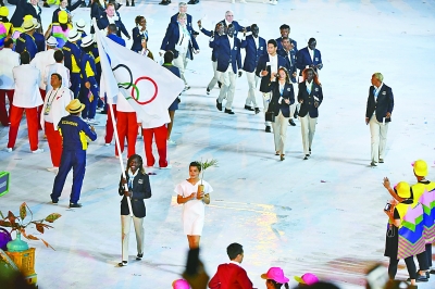 令人感动的是,仅有10名运动员的难民代表团倒数第二个出场,得到现场观众经久不息的掌声和欢呼。