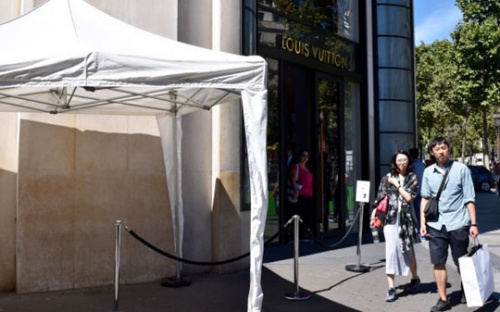 资料图:法国巴黎,两名游客走过香榭丽舍大街上的路易威登旗舰店。 (新华社记者李根兴 摄)
