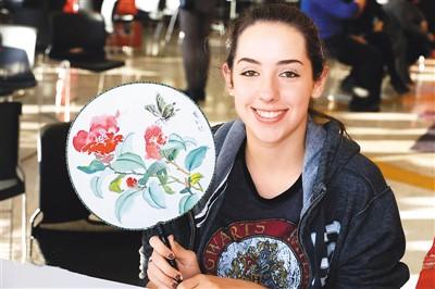 11月14日,一名美国学生在“中国文化周”活动中展示自己上色的中国团扇。