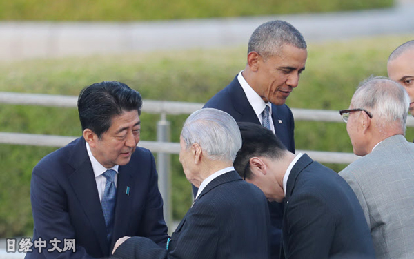 资料图:2016年5月27日,安倍与奥巴马在广岛与核爆受害者交谈。(《日本经济新闻》网站)