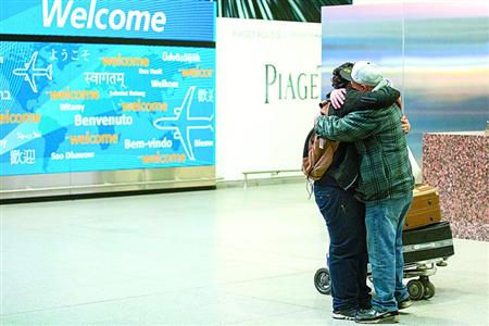 5日,曾被拒绝登机的也门男孩(左)抵达美国纽约肯尼迪机场后与父亲拥抱。新华社/美联