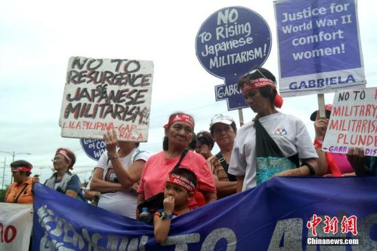 1月12日,菲律宾多个民间团体在日本驻菲大使馆前举行集会抗议活动,要求日本政府向慰安妇受害者正式道歉、赔偿。图为参加集会抗议的人群。1月12日至13日,日本首相安倍晋三对菲律宾进行正式访问。中新社记者 张明 摄