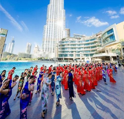 2017年1月15日,身着旗袍的快闪活动参与者在阿联酋迪拜世界最高建筑——哈利法塔脚下表演。(新华社资料图)