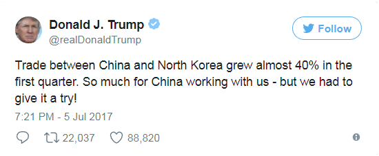 针对特朗普推特中所说的中朝贸易内容,《环球时报》记者6日向中国商务部提出了相关问询。商务部对《环球时报》表示,近年受多种因素影响,中朝双边经贸合作出现下滑,2016年,中朝贸易额同比下降2.5%,中国企业对朝投资额下降了14.3%。我们将在认真履行有关国际义务的同时,同朝方开展经贸往来。