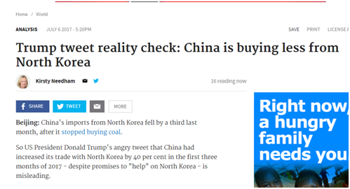 【环球网综合报道】“中国与朝鲜的贸易在今年第一季度增加了将近40%。中国就是这样跟我们合作。但我们不得不试试看!”这是美国总统特朗普5日在自己的推特账号上发布的一段话,这两天吸引了很多关注。然而,特朗普说的是事实么?澳大利亚媒体《悉尼先驱晨报》很快做出了一个有些“打脸”的回应:自从中国停止从朝鲜购买煤炭后,上个月中国从朝鲜的进口下滑了三分之一。
