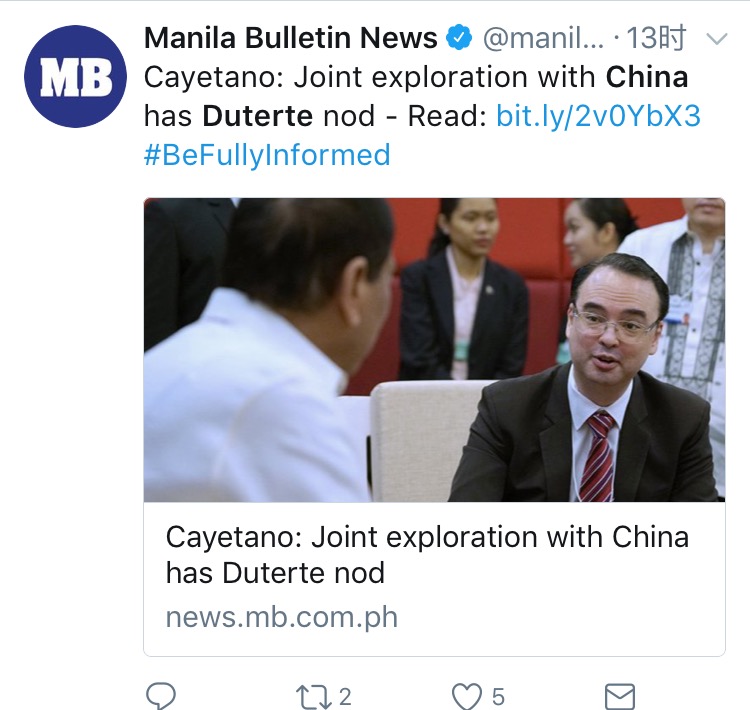 “菲律宾总统杜特尔特已批准菲律宾在南海与中国进行联合勘探,”《菲律宾商报》8月17日报道称,菲律宾外交部长卡亚塔诺16日在记者会期间向记者证实了此事。