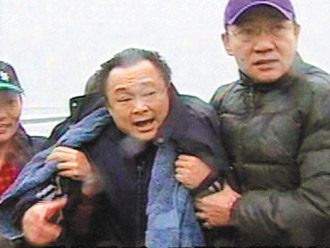 王世坚上岸后又冷得发抖,很是狼狈(电视画面翻拍)