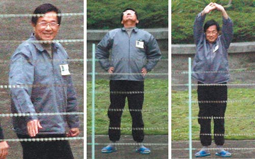 12日下午,陈水扁在台北看守所放风运动,他双手叉腰,身体向后伸展,还冲着在附近大楼楼顶守候的记者笑,好像要摆姿势给记者拍照。