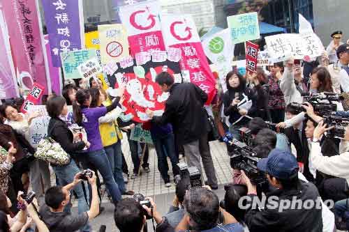 11月26日,台湾数10个社会团体到台北壹传媒大楼,抗议该媒体推出的“动新闻”内容涉及膻色腥、暴力和有侵犯隐私之嫌,台北市政府和台湾有关方面也正陆续出台处罚措施。(图片来源:中新社)