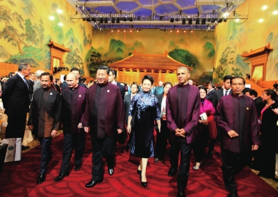 各国领导人及配偶步入宴会大厅。(图片来源:新华社)
