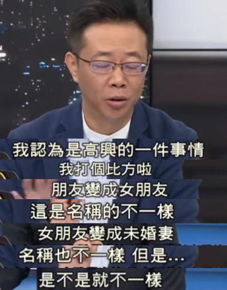 台湾政论节目《少康战情室》中,民进党“立委”张宏陆就此事欣喜表示,这次改名字是个高兴事儿。为了论证自己的结论,张进行了这样一番阐述:你看,朋友变女朋友,名称不一样!女朋友变未婚妻,名称也不一样!是不是亲密度就不一样了!