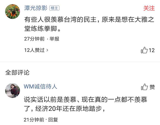 很多年前,“台式民主”曾经给一些大陆人留下过不错的印象;但随着信息的开放,当大陆网友对台湾政坛有了更深入、更直观的认识后,“台式民主”的神秘感消失了,大陆网友的崇拜感和台湾网友的优越感也在消失。再加上,大陆网友自身的制度自信不断增强,对“台式民主”很容易产生“本以为是个王者,没想到是个青铜”的感觉。