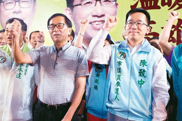 陈水扁日前参加儿子陈致中高市议员党内初选造势晚会,因上台送好彩头,被中监认定违反“不上台”规定。(图片来源:台湾《联合报》)
