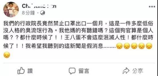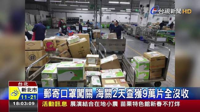 台媒报道,1月底的两天内,台湾海关没收了9万多片台湾民众携带或寄送给大陆的口罩。台财政部门在社交媒体上赫然警告:“口罩管制来真的,休想挑战公权力。”