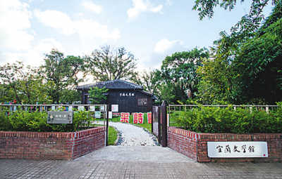 于是,我们来到了旧城南路。丛林掩映中,隐约可见一处所。循着细碎的白色鹅卵石慢慢走,铅红色的砖砌矮墙上悬挂匾牌说明来处——旧宜兰农林学校校长官舍。踏入庭院,别有洞天。花树繁茂,绿草茵茵,蜿蜒小路延伸到一处日式的老建筑,上书——宜兰文学馆。
