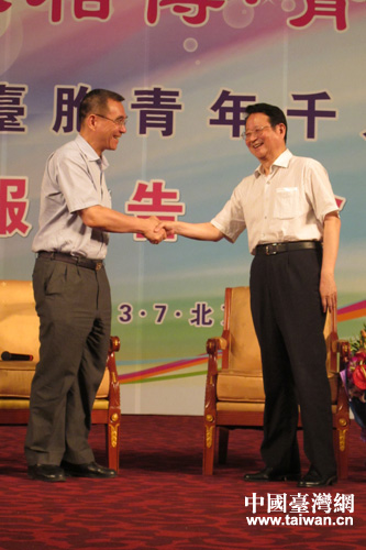 2013全国台联台胞青年千人夏令营7月4日在京举办专场报告会,世界银行前副行长、著名经济学家林毅夫与全国台联会长、台盟中央副主席汪毅夫联袂为在场千余名两岸青年做主题演讲,图为二人亲切握手。(图片由本文作者提供)
