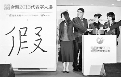 由《联合报》等单位主办的台湾2013代表字评选12月9日揭晓,“假”字获选年度代表字。据主办方介绍,票选前10名分别为假、黑、毒、乱、谎、闷、混、真、醒、安、食,其中“食”与“安”同票并列第10名,反映出民众对食品安全的渴望。