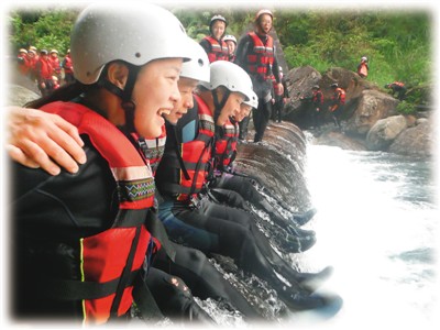 教练配合地形,设计多项关卡,以增加娱乐效果和团队的亲近感。水帘之上,七八人交叉搭肩,一起滑下潭去。深不见底的水潭阻挡行路,教练抛过一条绳索,大家拉着它逆着强大水流,与下冲的力度抗衡。在多个溪段,一伙人就这样拉着绳子或水或岸,互相帮助向上游挺进,这种合作,很容易增强团队默契和友谊。在一个开阔的潭里,教练教起了水上芭蕾阵,20多人仰卧水中以脚夹腰以手划水,结成一条S形的人龙,在水中摇摆着挪动,谁做得不默契,龙阵就断了。