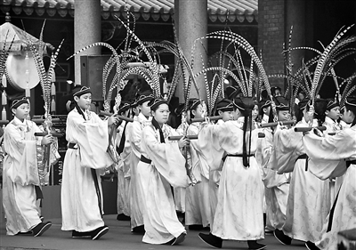 9月28日是孔子诞辰纪念日,也是台湾的教师节,每年台北孔庙依循古礼举行祭孔仪式。图为祭孔仪式上,佾生表演八佾舞。新华社记者 鲁鹏摄