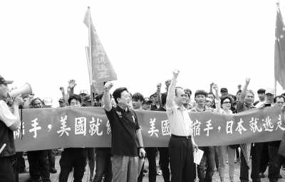 台湾统派政治团体振臂高呼“两岸齐心,保卫钓鱼岛”“两岸联手,美国就缩手,美国一缩手,日本就逃走”。 本报记者 徐 蕾摄