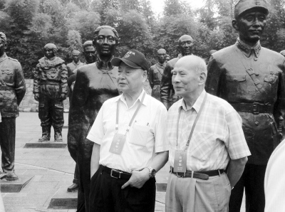 王文燮(左)和黄埔军校同学会会长林上元在抗日烈士群像前合影。