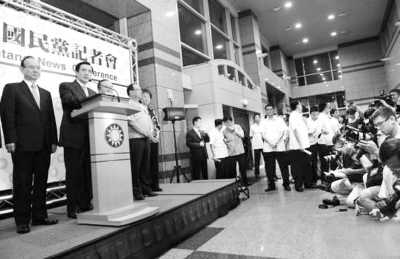 马英九连任党主席后举行记者会。(图片来源:中新社)
