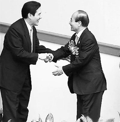 “关说风波”爆发后,马王数度在公开场合握手,营造团结氛围,但私下里依然不能和解。(图片来源:中评网)