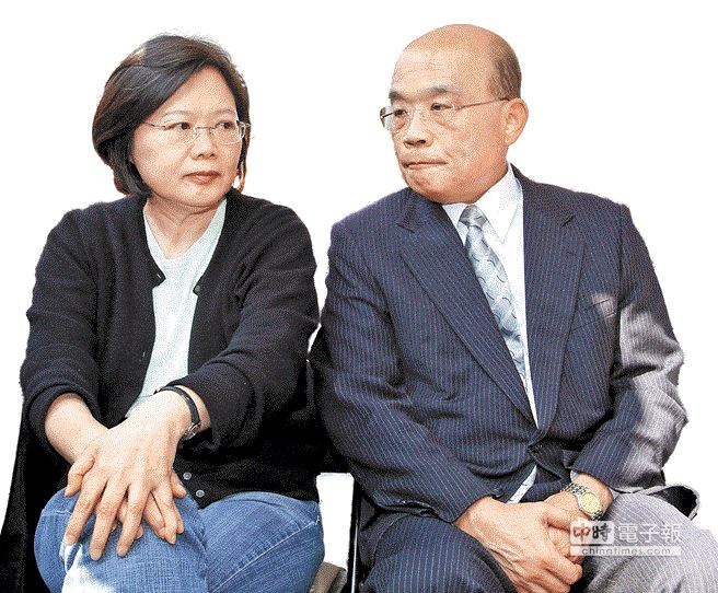 图 民进党主席苏贞昌(右)与前党主席蔡英文(左)是否再度披挂上阵选台北市长,基层焦虑感浮现。图片来源:台湾中时电子报。(资料照片 姚志平摄)