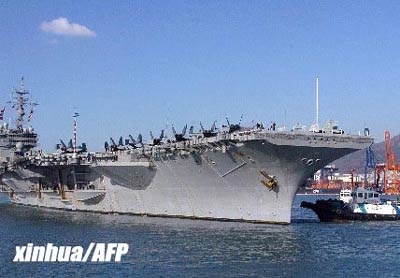 3月14日,美国海军“小鹰”号航空母舰搭载着5000多名美国海军官兵以及60架战机,抵达韩国南部港口釜山。 (新华社/法新 图)
