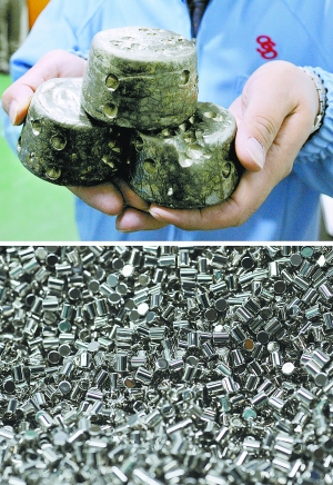 通过化学处理而成的块状稀土和由稀土原料制成的微型磁铁块原料(图片资料来源:北京晚报)