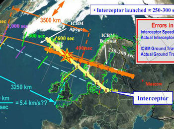 2级GBI反导拦截弹的拦截能力演示。图中橙色为假设的俄罗斯洲际导弹飞行轨迹,黄色为反导拦截弹的飞行轨迹,洲际导弹大约在飞行5分钟后被拦截。