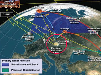 小布什时代计划在捷克部署一部中段雷达(EMR)以实现对反导拦截弹的火控和制导。图为美在东欧导弹防御系统工作示意图,红圈处即为该雷达。