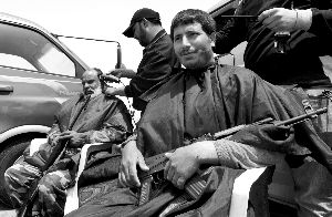 4月24日,利比亚艾季达比耶市,反对派武装分子在战斗之余修整头发。