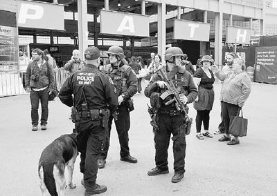 五月二日,警察在美国纽约世贸中心旧址附近的地铁车站入口巡逻。