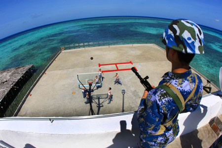 南沙卫士在礁盘上打篮球。新华社记者 查春明摄 资料图片