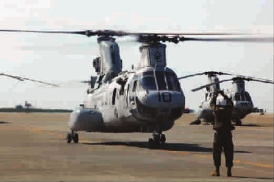 在演习中支援美军第31远征队的CH-46E“海上骑士”运输直升机
