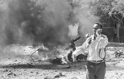 二月十七日,索马里摩加迪沙一警察局发生汽车炸弹爆炸,一名警察在现场打电话请求援助。新华社发