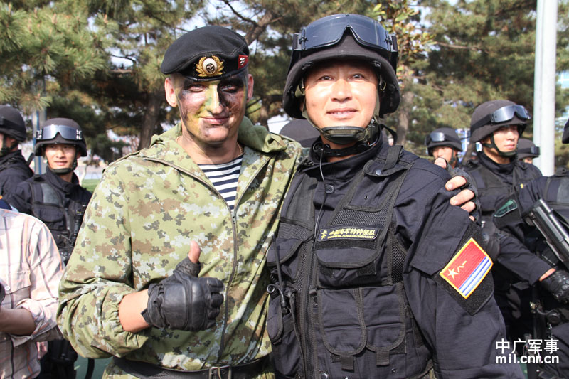 2012年4月23日下午,在俄方参演军舰停靠的码头上,参加“海上联合-2012”中俄海上联合军事演习的中俄双方海军特战队员进行表演交流。图为带队表演的中俄双方特战队军官。摄影:穆亮龙