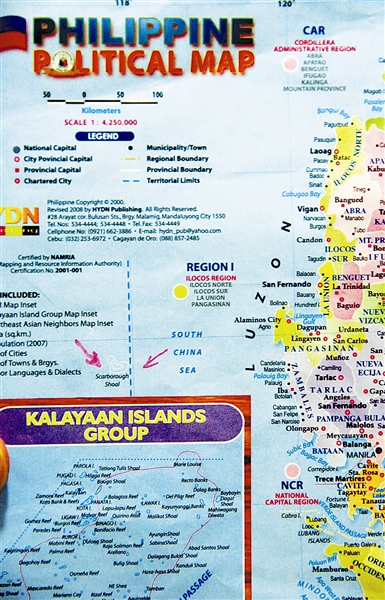 这是一张由菲律宾国家地图绘制与信息资源总局认证、2008年版的菲律宾行政地图,图中将黄岩岛(菲方称Scarborough Shoal,图中箭头所指)清楚地标记在东经118度菲律宾的边界线之外。新华社记者许林贵2009年2月23日摄。本报资料照片