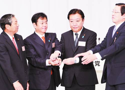 9月21日,日本首相野田佳彦(右二)在日本首都东京举行的民主党代表(党首)选举上与其他候选人握手。野田佳彦当日在执政的民主党代表选举中击败竞选对手,获得连任。