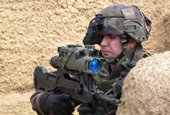 法国FELIN系统配备有先进光学设备的武器(FAMAS突击步枪、MINIMI轻型机枪和FRF2步枪)。该系统配备的突击步枪、轻机枪、狙击步枪都安装了专用红外成像增强瞄准镜。突击步枪瞄准镜内集成了电视摄像机,可将图像传输到士兵胸前的电视监视器或头盔上的目镜显示器中,这使武器拐角隐蔽精确射击成为可能。