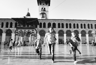 叙利亚儿童在大马士革的倭玛亚清真寺前玩耍。焦翔摄