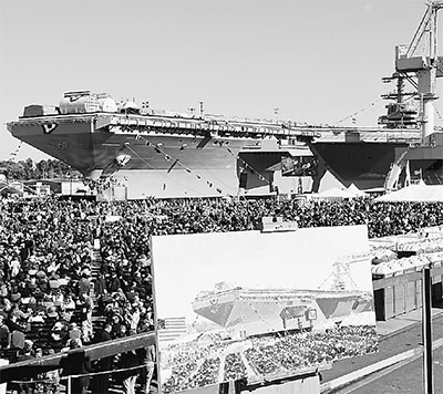 当地时间11月9日,美国海军最新一艘核动力航空母舰“杰拉尔德·福特”号在弗吉尼亚州纽波特纽斯一处造船厂举行命名及下水仪式,该舰以美国已故前总统福特的名字命名。这一仪式标志着美国新一代“福特”级航母的首舰正式投入使用,预计最快将于2016年初进入美军现役航母编队。由于该舰耗资巨大,建造过程中屡屡遭到国会议员的抨击。