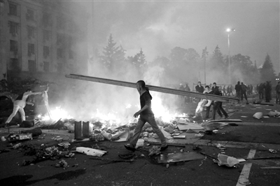 图为5月2日,在乌克兰南部城市敖德萨,工会大楼附近的一个临时帐篷被烧毁。乌克兰南部黑海沿岸城市敖德萨2日发生亲政府与反政府两派民众冲突,导致43人死亡。新华社发