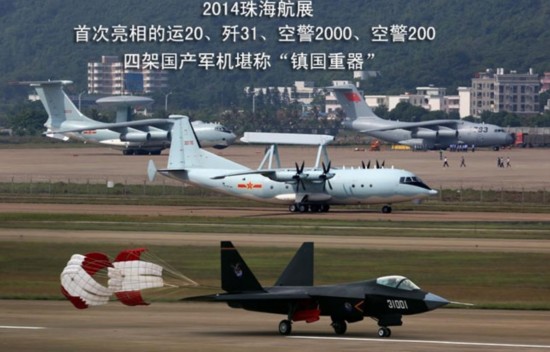 在2014珠海航展上首次展示的运20、歼31、空警2000、空警200四架国产军机堪称“镇国重器”,一经亮相就成为人们关注的焦点。图片中由上至下依次为空警2000(左)、运20、空警200、歼31(拼图)。