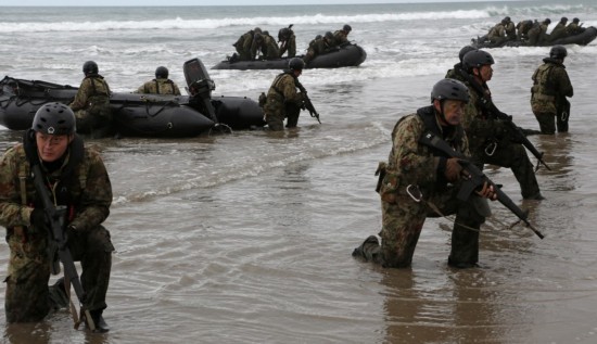 2月21日,美国加利福尼亚州海军陆战队训练基地内,一队日本陆上自卫队员正在进行渗透登岛作战演练。该演习是美日双边演习的一部分,代号为“运动铁拳2015”。主要是提高美日协同作战能力及锻炼自卫队登陆作战能力。