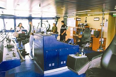“迪克斯莫德”号每级舷梯之间间隔很小,记者攀登近乎垂直的舷梯略显费劲,而弗拉尔却上下自如。记者跟随弗拉尔来到驾驶室,驾驶室很宽敞,视野通透,站在驾驶室,周边海域情况一览无余,驾驶室左前方有一个单独的座椅,除舰长外任何人不能入座。