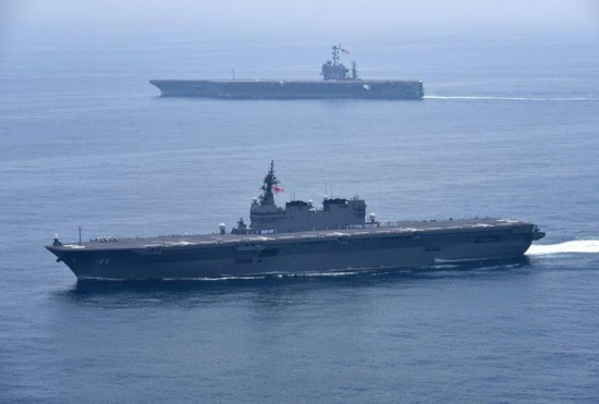2015年5月18日,美军华盛顿号核航母与日本自卫队出云号准航母离开横须贺基地,在西太海域拍摄合影照片,随后华盛顿号将返回美国本土,里根号航母将接替华盛顿号。美军士兵在甲板上摆出了“さようなら”字样,意为“再见”。华盛顿号2008年部署在日本,以横须贺港为基地,用于执行警戒中国、朝鲜日