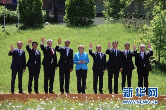 6月7日,在德国南部巴伐利亚州的山区小镇加米施-帕滕基兴,七国集团峰会与会者在埃尔毛宫酒店外合影。七国集团峰会于7日至8日在德国南部加米施-帕滕基兴市的埃尔毛宫酒店举行。 新华社记者朱晟摄